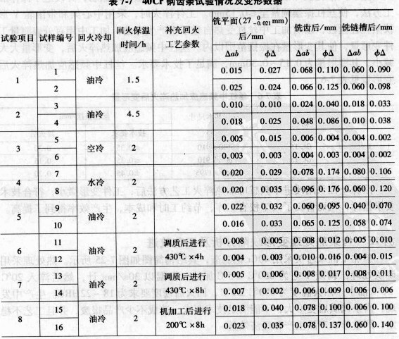 40Cr鋼齒條試驗情況與變形數據如表7-7所示。從表7|7試驗數據分析可以看出,造成工件在冷加工中變形的主要原因是調質熱處理中產生的熱應力。為消除工件熱處理中熱應力危害,可采取以下工藝改進措施:
