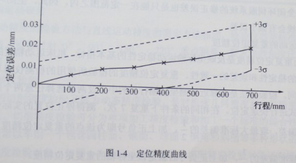 視機床規格選擇20mm, 50mm。或100mm的間距,用數據輸入法做正向和反向快速定位,側出實際值和指令值的偏差.為了反映多次定位中的全部誤差,國際標準化組織規定每一個定位點進行5次數據測量,計算出均方根值和平均偏差±3歐。定位精度是一條由各定位點平均值連貫起來有平均偏差土3歐構成的定位點離散誤差帶,如圖1-4所示。