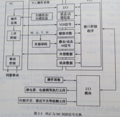 ????SIEMENS 810T/M“系統(tǒng)自帶一個(gè)集成式PLC,用于實(shí)現(xiàn)系統(tǒng)與機(jī)床的接口和電氣邏輯控制。集成式PLC就是數(shù)控裝置沒有單獨(dú)的PLC的CPU,硬件上與NC不能分離,不屬于某型號(hào)的PLC與NC實(shí)現(xiàn)接口或者通信而構(gòu)成系統(tǒng)的模式.編程語(yǔ)言采用SIEMENS SIMATIC S5系列PLC的語(yǔ)言STEPS. PLC與NC間的信號(hào)交換如圖2-3所示。